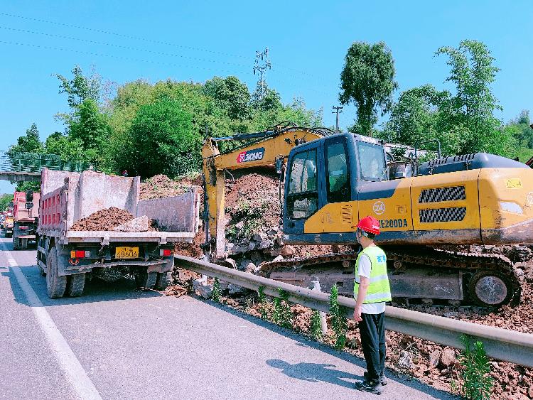 演练中,模拟因连续降雨、间断性强降雨等因素,导致隆纳高速渠坝连接线K2左幅附近边坡发生塌方,造成边沟堵塞,部分碎石滚落在应急车道上,现场无人员受伤,无车辆受损,但山体存在悬石,有可能发生再次垮方,对过往车辆构成危险,情况紧急。泸州管理处立即启动《南方公司地质灾害专项应急预案》,相关单位接警后迅速行动,按照各自职责开展灾害现场管控,养护、日常养护单位立即对塌方现场进行勘察,并对高边坡悬石进行处置。各参演单位组织有序、协同配合,迅速完成抢险救灾任务。