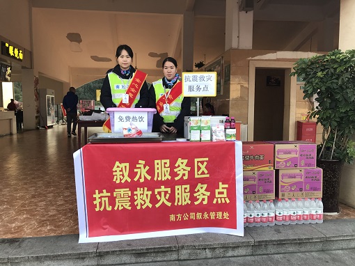 发布日期:2018-12-18 发布来源:南方公司 阅读量:970次12月16日12时46分,四川宜宾市兴文县周家镇发生5.7级地震。地震发生后第一时间,叙永管理处辖区服务区立即组织商家、物业公司等单位,共同设置临时抗震救灾服务点,为赶赴灾区抗震救灾的人员提供咨询帮助,并免费提供汤圆、方便面、矿泉水等物资,用实际行动支援灾区抗震救灾工作。