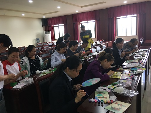 各分工会活动现场,大家看到准备的团扇、布料、香料以及针线等各式材料便跃跃欲试了,在老师的引导下,开始穿针线、装香料、做彩绳,并且用五颜六色的颜料给团扇上色。手工制作活动结束前,大家纷纷拿起自己缝制的香包、团扇合影留念,整个活动现场很是热闹。