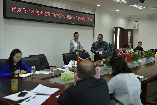 发布日期:2018-03-22 发布来源:南方公司 阅读量:1,109次为认真学习贯彻党的十九大精神,全面准确掌握党章内容,引导广大党员更加自觉学习党章、遵守党章、贯彻党章、维护党章,3月22日,公司机关党支部开展了“送党章、学党章”主题党日活动。公司党委书记、董事长、总经理蔚红同志将新修改的《中国共产党章程》送到支部每一位党员手里,公司机关党委书记刘宇主持会议,并带领大家重点学习了党的十九大对党章修改和增写的内容。